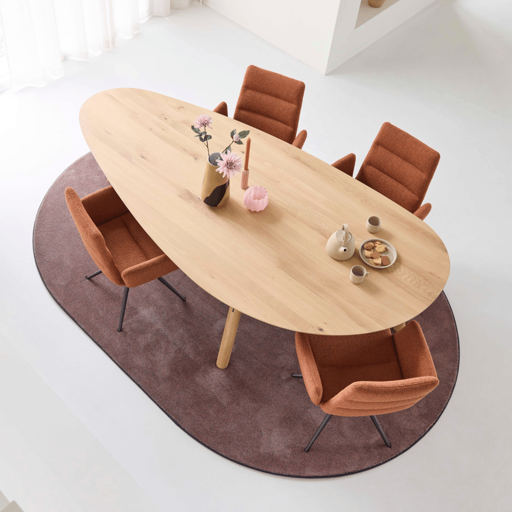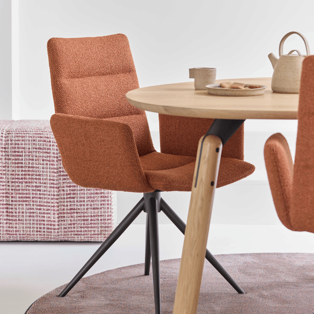 Je kunt de stoel naar wens personaliseren met andere stoffen, kleuren of een duo-stoffering voor een extra speels effect. Kom langs in onze showroom in Cruquius en probeer ‘m zelf uit. Onze adviseurs helpen je graag met de perfecte match voor jouw eettafel en interieur. Kom langs bij De Ruijtermeubel