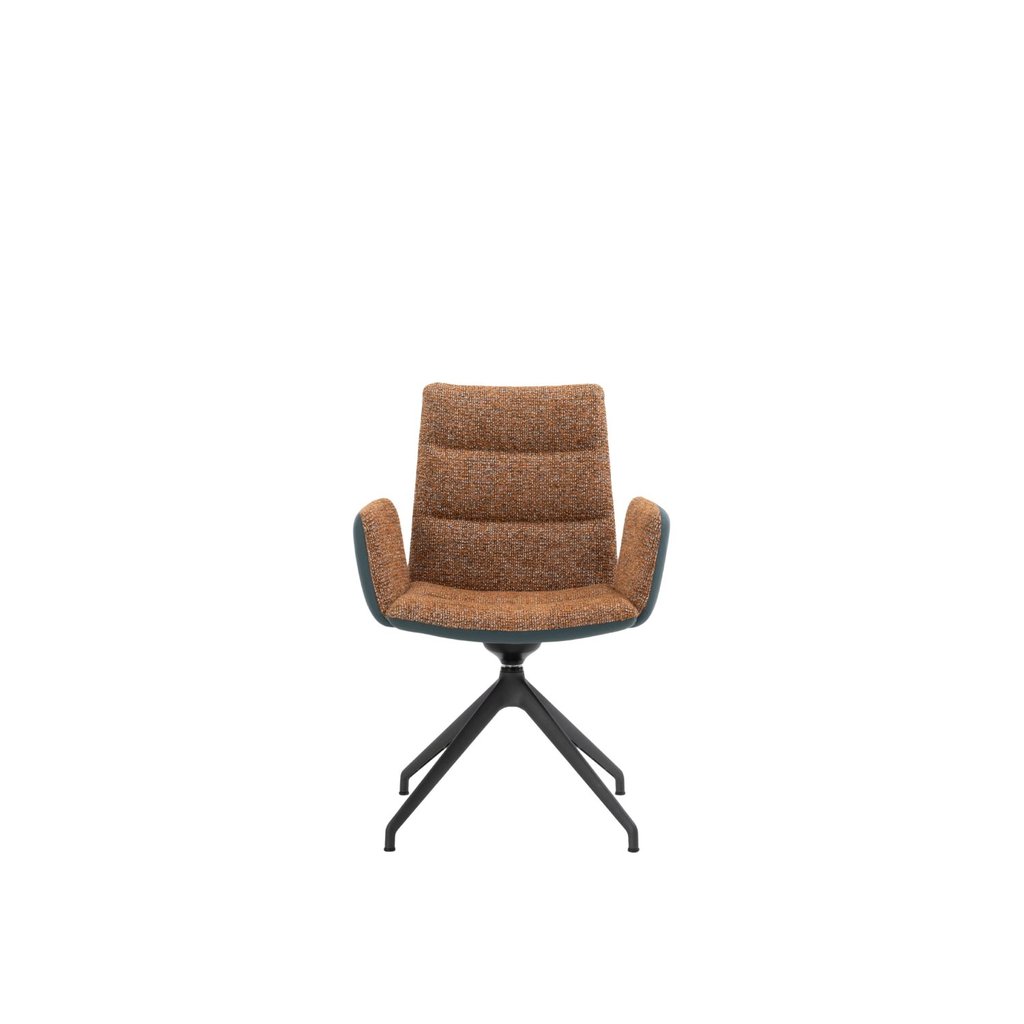 De stoel is bekleed in stof uit prijsgroep B, zoals het sfeervolle London 02 Stracciatella, een zachte, onderhoudsvriendelijke bekleding met warme uitstraling. De vaste statiefpoot in antraciet met kunststof doppen zorgt voor stabiliteit én een subtiele, moderne look. Door de licht gebogen rug en prettige armhoogte zit je ontspannen en ondersteunend.