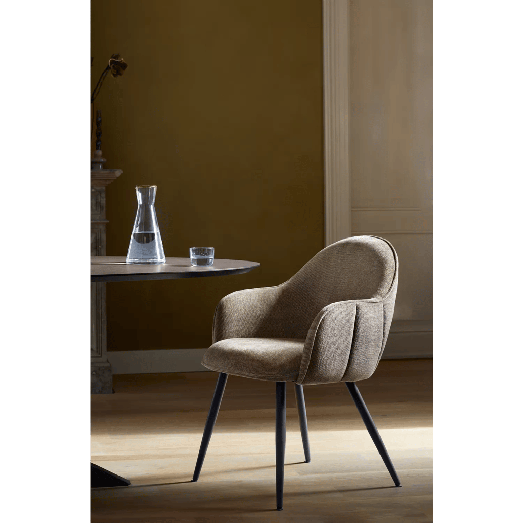 Eetstoel Aquino zit niet alleen heerlijk, maar ziet er ook nog eens geweldig uit! Verkrijgbaar in vier prachtige kleuren in zowel een eet- als een armstoel model. De eet- en armstoelen hebben een opvallende, unieke uitstraling. De stof voelt zacht aan en geeft de stoel een subtiel vintage karakter en de ronde lijnen met een prachtig stiknaad vallen deze stoelen meteen op. De metalen poten zorgen voor een robuuste, speelse look. Perfect te combineren met een mooie tafel voor een stijlvolle eetkamer.
