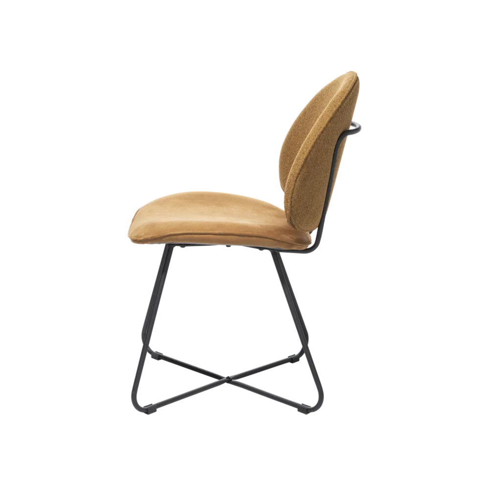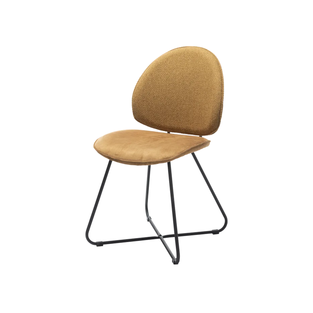 Eetstoel Luna okergeel van het woonmerk Henders & Hazel heeft de vorm van een halve maan. Daar past de naam perfect bij. Deze eetkamerstoel heeft prachtige organische vormen, een leuk tubeframe in het zwart en een dubbele bekleding. De rugleuning is namelijk bekleed in de stof Ponti, terwijl de zitting is bekleed met de microvezelstof Calabria. Deze stoel kun je goed combineren met diverse eetkamertafels. Dat wordt heerlijk tafelen met je vrienden en familie!