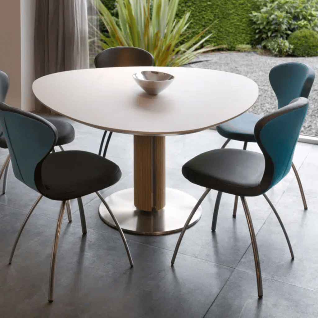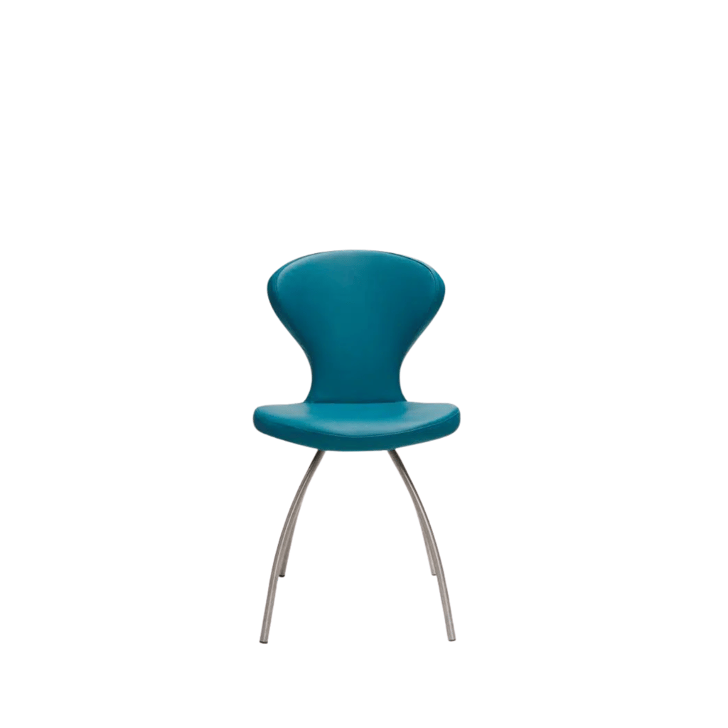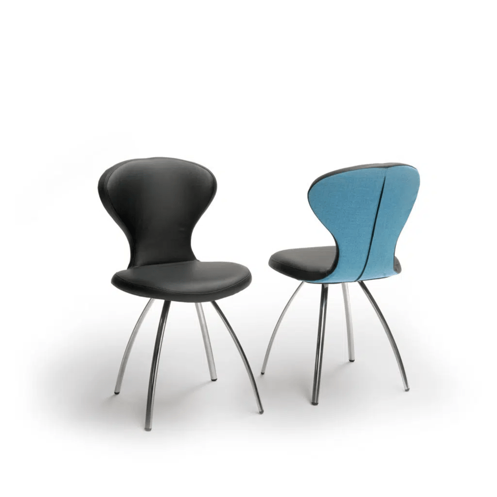 De Rikki biedt volop mogelijkheden om de stoel naar wens samen te stellen. Hij kan volledig worden bekleed in stof, leer of een combinatie van beide. Juist door te variëren met contrasterende materialen en kleuren ontstaat een unieke en persoonlijke uitstraling. Voor het onderstel kun je kiezen uit een rond of ellipsvormig frame, uitgevoerd in RVS, mat chroom of in een epoxy kleur zoals antraciet, beige, wit, zwart of anodic brown. Dankzij de zithoogte van 48,5 cm en zitdiepte van 41,5 cm zit de stoel comfortabel en ondersteunend, terwijl het compacte formaat van 48 cm breed en 55 cm diep hem geschikt maakt voor zowel grote als kleinere eethoeken.