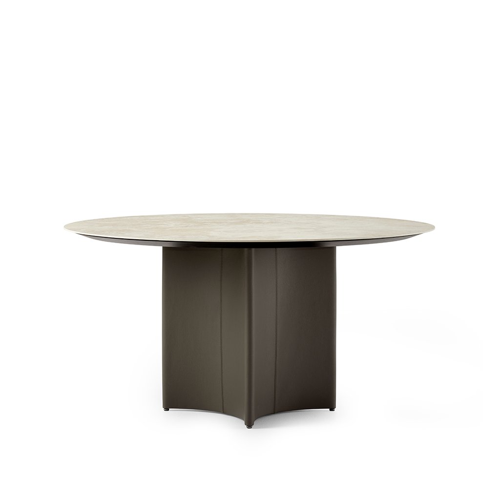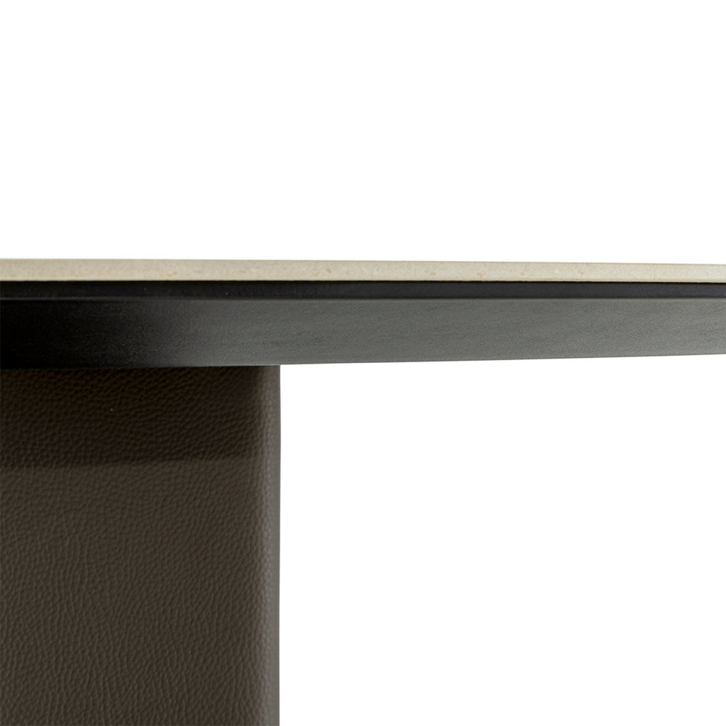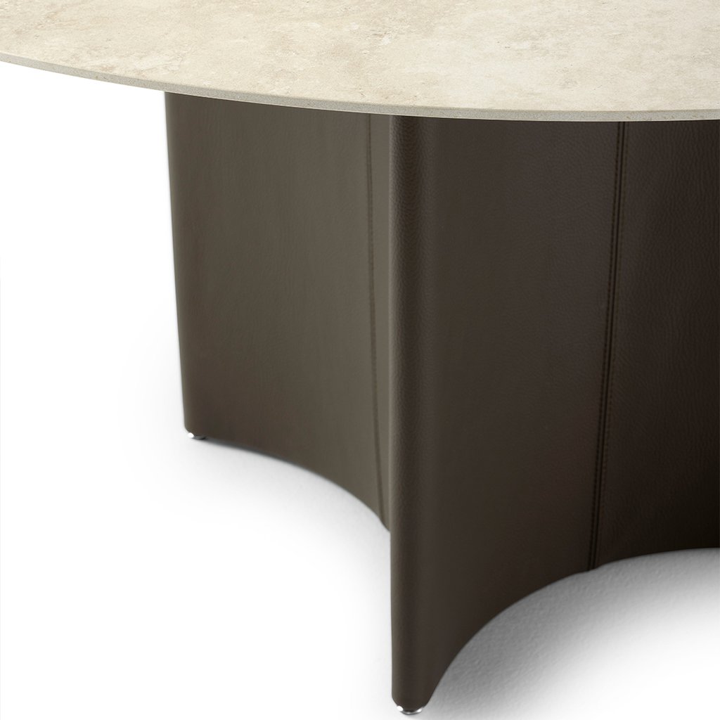 De ruitvormige kolom onder het blad is bekleed met hoogwaardig leer, wat zorgt voor een opvallend contrast met het tafelblad. Deze bijzondere vorm is niet alleen stijlvol, maar ook functioneel: hij biedt voldoende beenruimte en draagt bij aan een luchtige, ruimtelijke uitstraling. Conka combineert design, comfort en vakmanschap tot een centraal meubelstuk in je interieur.