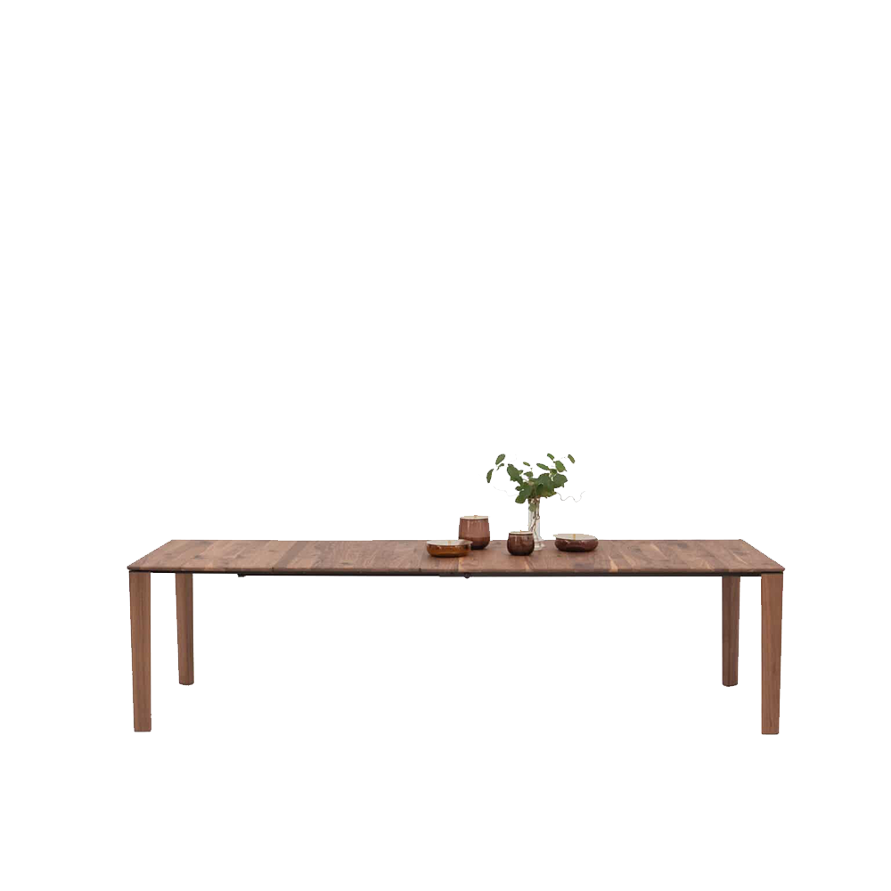 Deze eettafel kan ook als uitschuiftafel geleverd worden. Een hoogtepunt van het ontwerp is het innovatieve uittreksysteem. De tafel kan praktisch twee keer zo lang worden gemaakt als het moederblad, zonder afbreuk te doen aan stabiliteit. Met verborgen verlengstukken onder het moederblad kan de tafel moeiteloos worden uitgebreid, waardoor zelfs een bescheiden tafel van 150 cm lengte kan worden omgetoverd tot een royale 280 cm, met slechts vier hoekpoten die voor een stabiele ondersteuning zorgen.