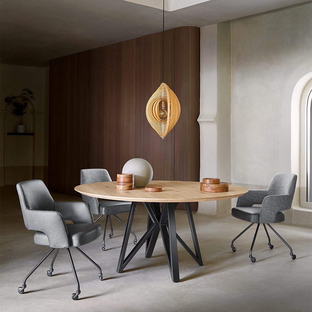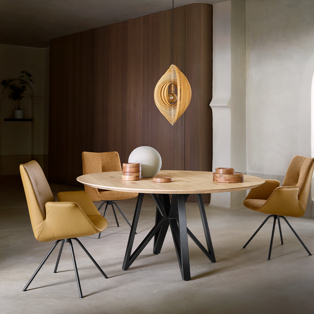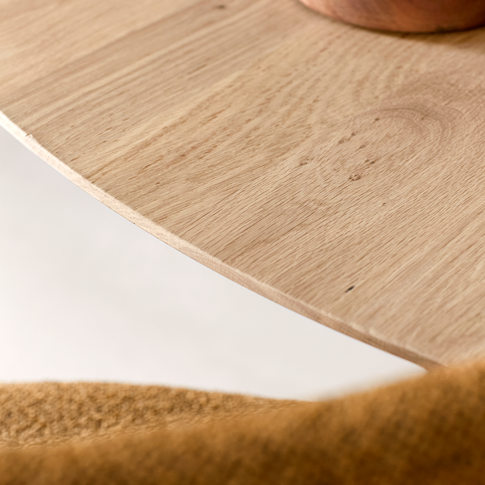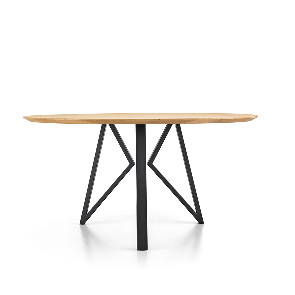 Met onze eettafel Dutchz 4000 heb jij de vrijheid om je eigen eetkamertafel helemaal naar jouw wens samen te stellen. Je hebt keuze uit verschillende bladvormen en poten, en daarnaast kun je ook kiezen uit diverse afmetingen. Zo kun je moeiteloos een prachtige eetkamertafel creëren die perfect bij jouw stijl en behoeften past. Het tafelblad van Dutchz 4000 is vervaardigd van licht rustiek eiken en heeft een dikte van 3,1 cm. Door de rustieke afwerking blijft de natuurlijke schoonheid van hout zichtbaar, en elk tafelblad is uniek. De bladrand van deze eettafel is subtiel verjongd onder een hoek van 22 graden. Deze eettafel wordt ondersteund door een stoere zwarte metalen poot, wat een eigentijdse uitstraling geeft. De tafel heeft een ronde vorm met een diameter van 160 cm en een hoogte van 77 cm.