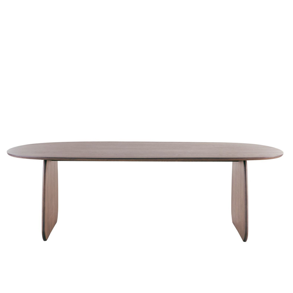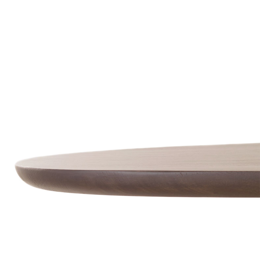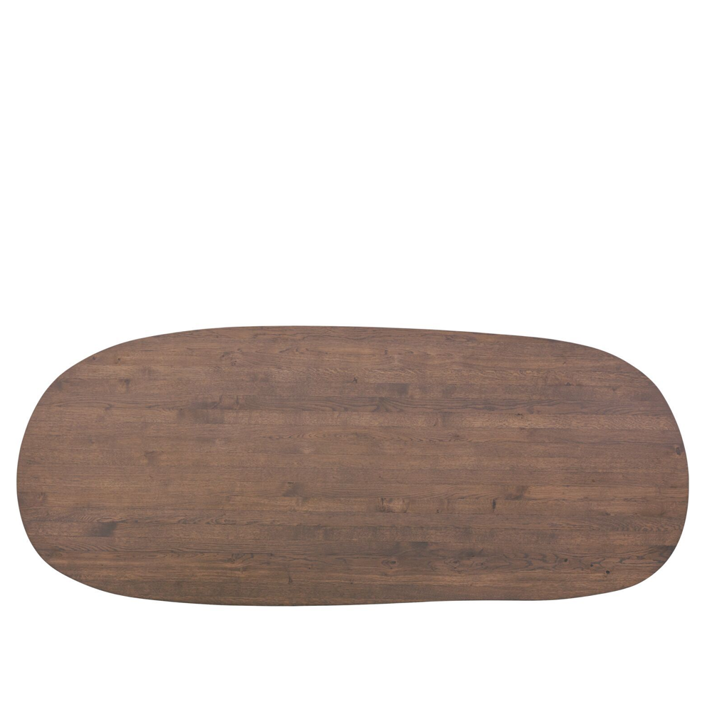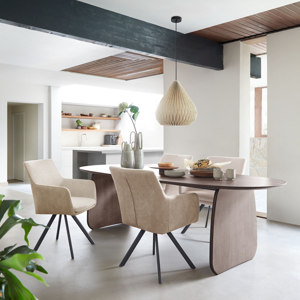 De Marandi eettafel is vervaardigd van hoogwaardig eikenhout en afgewerkt in de kleur Mocca STL036. Het blad heeft een zachte, organische vorm die zorgt voor een natuurlijke flow in de ruimte. Deze ronde lijnen maken de tafel toegankelijk en vriendelijk, terwijl de robuuste, gesloten poten juist stabiliteit en karakter toevoegen. Met zijn royale lengte van 240 cm biedt deze tafel plaats aan 6 tot 8 personen, ideaal voor gezinnen of wie graag gasten ontvangt.