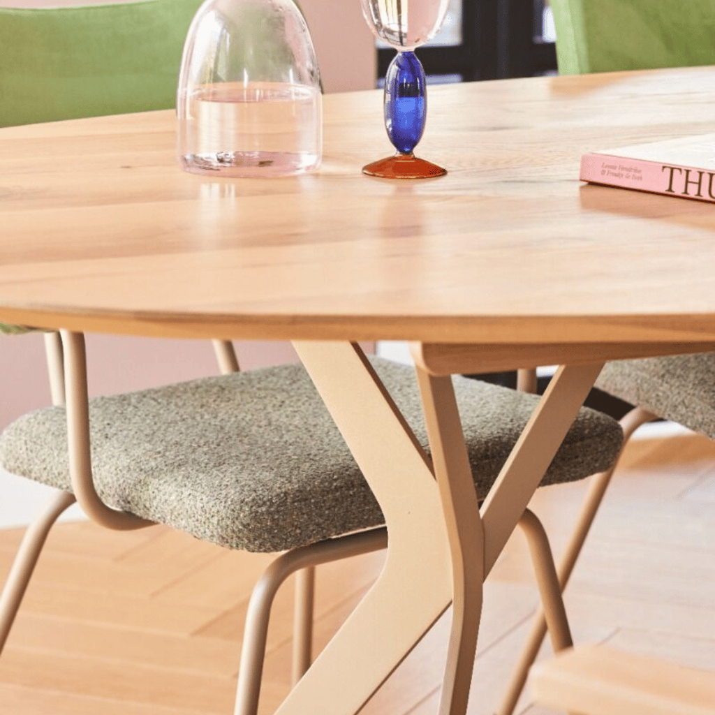 Bij alle eettafels kun je kiezen uit verschillende pootuitvoeringen. Poot Kai, een uniek metalen tripod poot met een interessant lijnenspel, zorgt voor een speelse en moderne uitstraling. Poot Ken, met zijn uitlopende houten poten, voegt juist een natuurlijke en warme sfeer toe aan de ruimte. Of je nu kiest voor Kai of Ken, beide poten zijn te personaliseren in verschillende kleuren, zodat de tafel perfect aansluit bij jouw interieur.