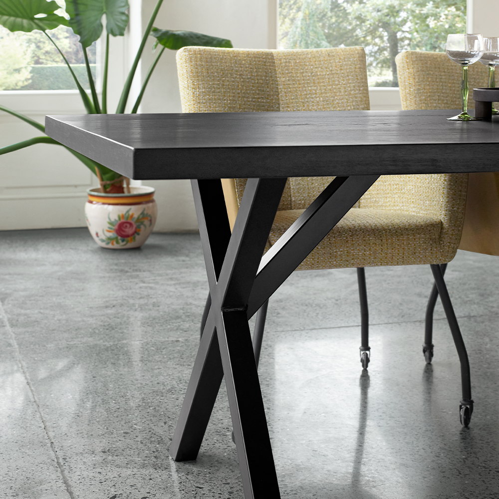 Eettafel Taranto is volledig zelf samen te stellen. Of je nou kiest voor een ovaal blad, een recht blad of bijvoorbeeld een boomstam blad of wat dacht je juist van verschillende onderstellen? Het is allemaal mogelijk. Kies voor een slanke U-poot of spin/matrix poot, het kan allemaal met deze eettafel. Daarnaast kun je ook nog eens uit hout en metaal kiezen.