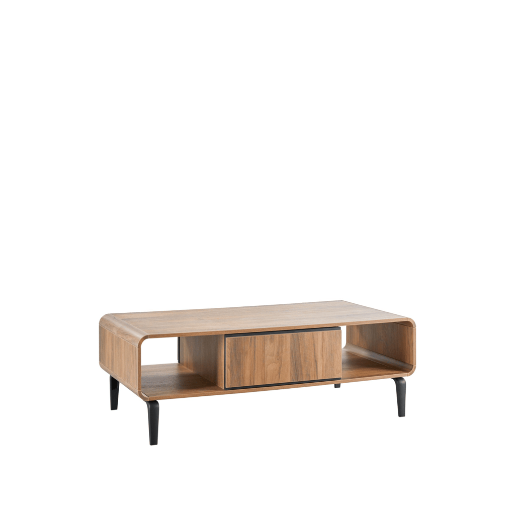 Salontafel Lagoria in walnootkleur met zwarte poten, 2 lades en 2 open vakken