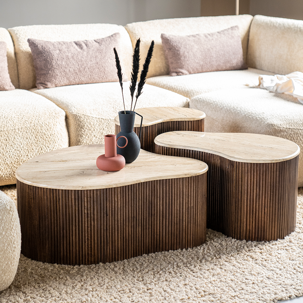 Dankzij zijn compacte formaat en opvallende ontwerp is salontafel Mari 70 ideaal voor verschillende ruimtes. Gebruik hem als stijlvolle aanvulling naast je bank, in een leeshoek of als decoratief element in de slaapkamer. De natuurlijke sfeer heeft salontafel Mari 70 te danken aan het mangohouten frame. De latjes geven een luchtig en speels karakter en vormen een mooi contrast met het massieve blad. Het blad is gemaakt van natuursteen, travertin. Travertin zien we steeds meer voorkomen in de interieurwereld en heeft een tijdloze charme. De unieke structuur met poriën en kleurschakeringen zorgt ervoor dat geen enkel blad hetzelfde is. De natuurlijke uitstraling wordt nog eens extra benadrukt door de organische vorm van de tafel. Het zachte, vloeiende design zorgt voor een elegante en natuurlijke uitstraling! Salontafel Mari 70 past dus perfect in een interieur waarbij je elementen uit de natuur wilt terug laten komen. En voor een speels effect combineer je deze salontafel met de andere tafels uit de Mari-collectie! Zet ze alle drie bij elkaar om een dynamische look te creëren door verschillende vormen en hoogtes met elkaar te mixen.