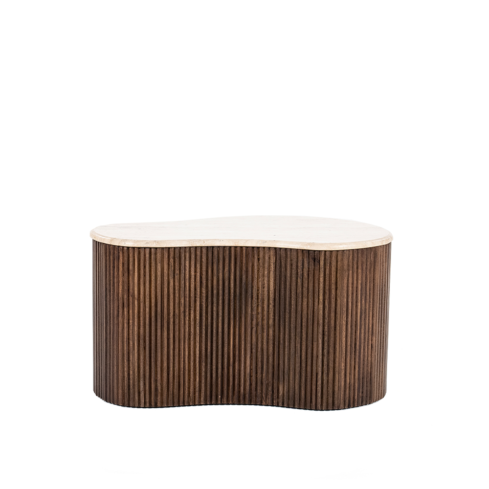Salontafel Mari 70 van Eleonora is een echte blikvanger die een warme en natuurlijke sfeer toevoegt aan jouw interieur. Het bijzondere ontwerp combineert een organisch gevormd tafelblad van travertin met een onderstel van smalle mangohouten latten. Deze unieke mix van materialen zorgt voor een eigentijdse, maar tijdloze uitstraling die in verschillende woonstijlen tot zijn recht komt, van modern tot bohemian en klassiek.