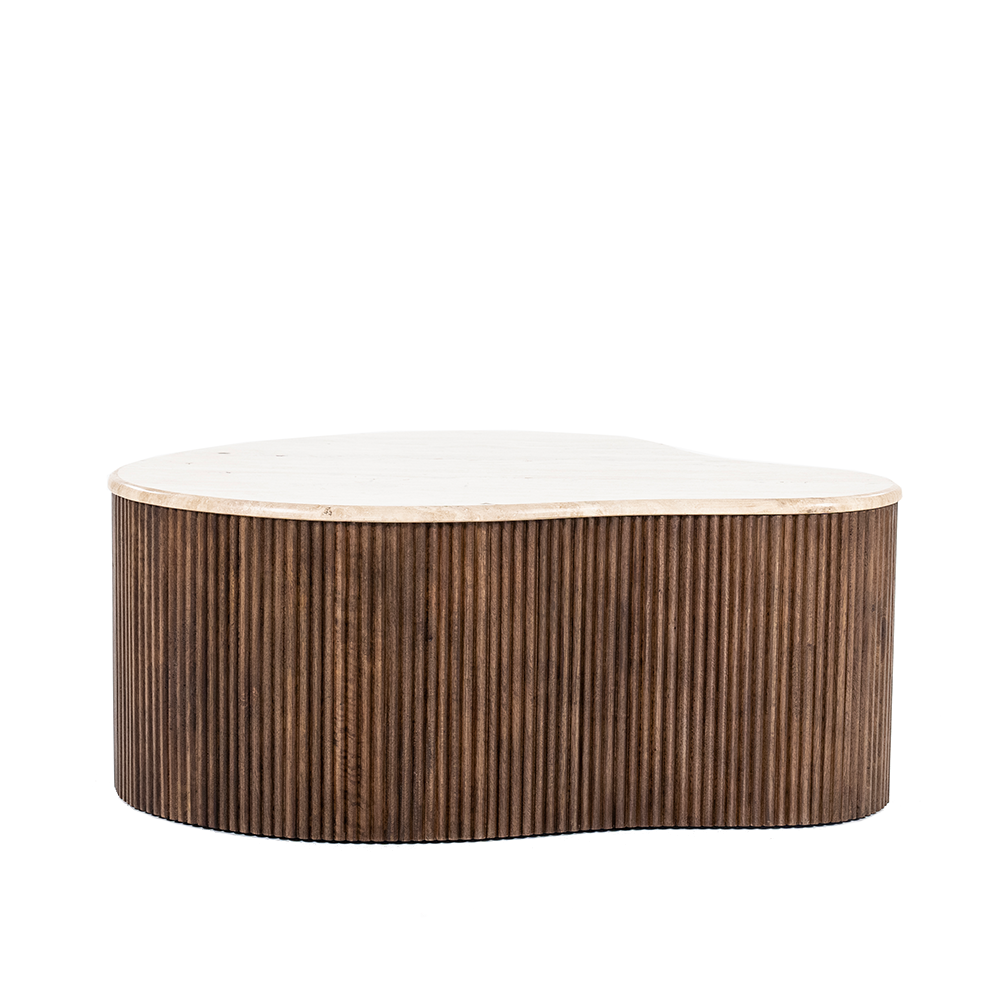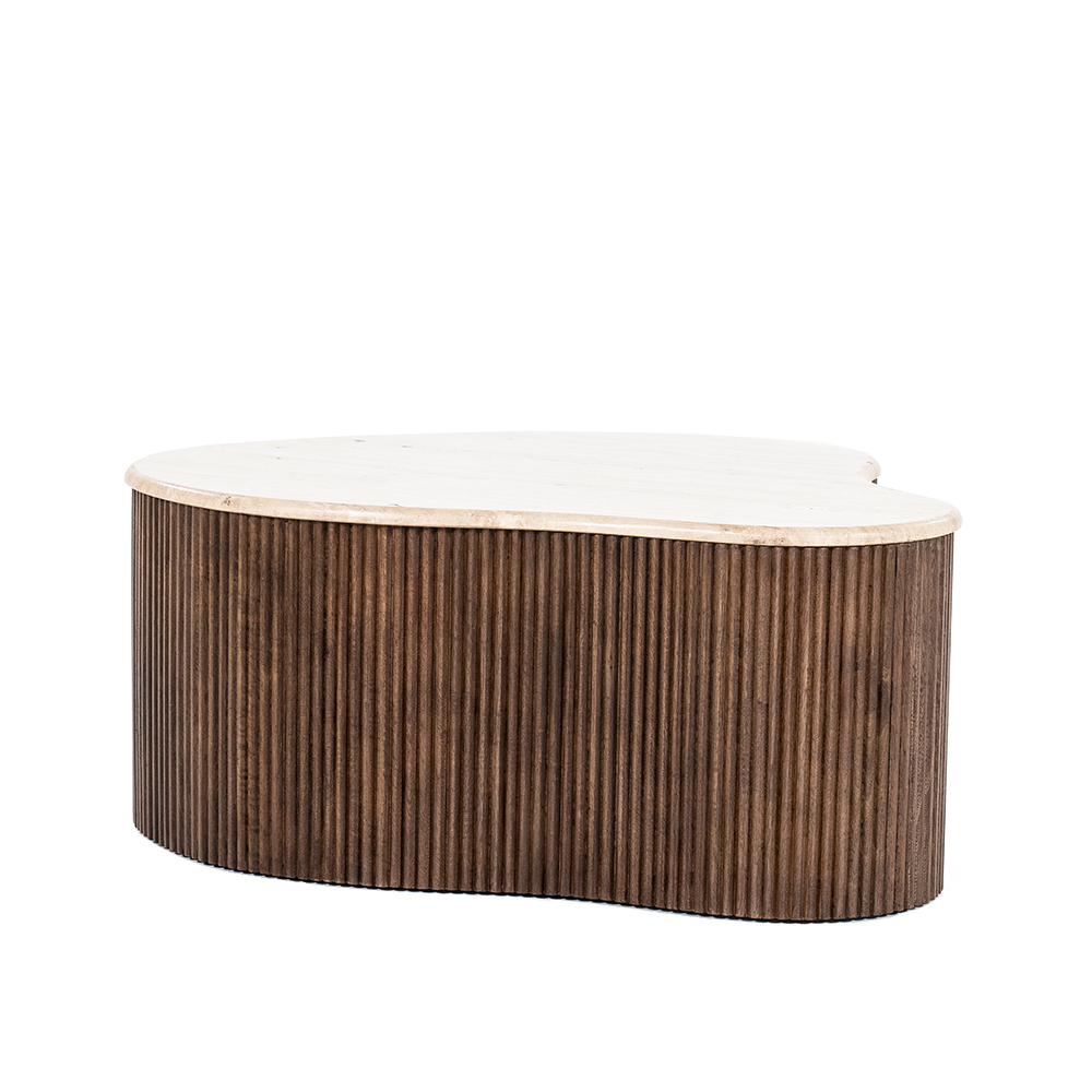 Salontafel Mari 83 van Eleonora is een echte blikvanger die een warme en natuurlijke sfeer toevoegt aan jouw interieur. Het bijzondere ontwerp combineert een organisch gevormd tafelblad van travertin met een onderstel van smalle mangohouten latten. Deze unieke mix van materialen zorgt voor een eigentijdse, maar tijdloze uitstraling die in verschillende woonstijlen tot zijn recht komt, van modern tot bohemian en klassiek.