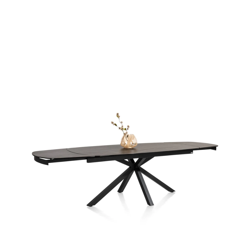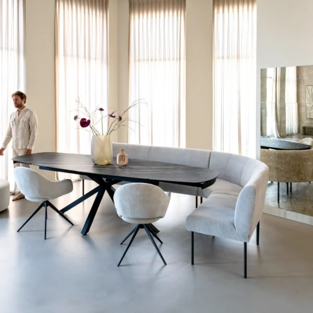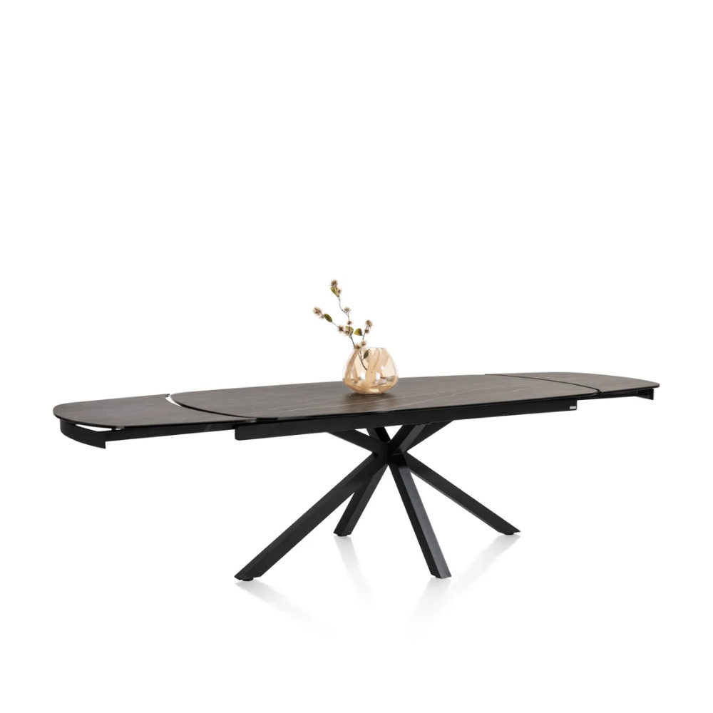 Het blad van Uitschuiftafel Montello is uitgevoerd in keramiek op glas. Dit materiaal is bijzonder sterk, krasvast en eenvoudig te reinigen, waardoor het ideaal is voor dagelijks gebruik. Of je nu met kinderen aan tafel zit, graag uitgebreid kookt of vaak gasten ontvangt, Montello is ontworpen om het allemaal aan te kunnen. De marmerlook in zwart oogt luxe maar is tegelijkertijd veel onderhoudsvriendelijker dan echt natuursteen.
