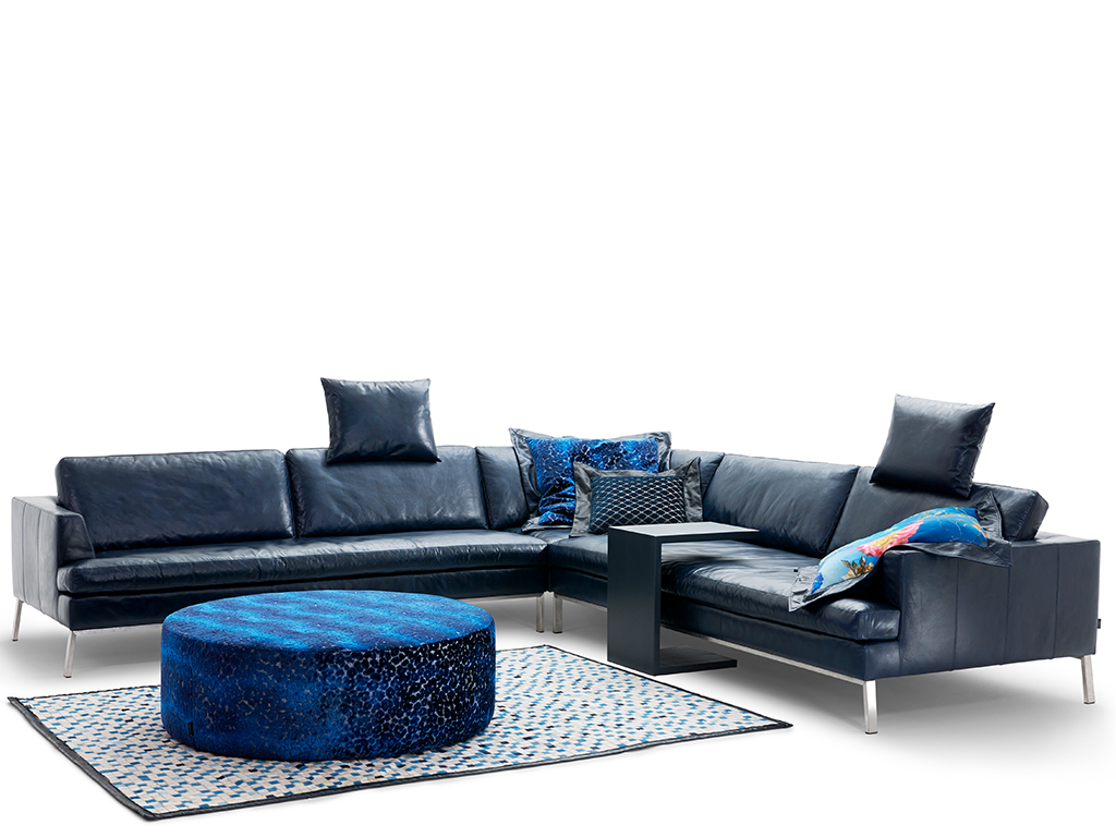 Stel je een woonkamer voor met een royale hoekbank van BAENKS in een zachte kiezelgrijze kleur. Door hier een fauteuil bij te plaatsen in een net iets donkerder antraciet, creëer je een hoek die rust uitstraalt maar toch spannend blijft. De ranke poten van de meubels, vaak uitgevoerd in matchy metaaltinten, dragen bij aan het luchtige gevoel in de ruimte. Ook de salontafels van dit merk, uitgevoerd in materialen als keramiek of eikenhout, zijn beschikbaar in kleuren die naadloos aansluiten bij de zitmeubels. Ook kun je, zoals hieronder, mooie tinten blauw combineren (bank, poef, vloerkleed en kussens) zodat alles één geheel vormt in je woonkamer.