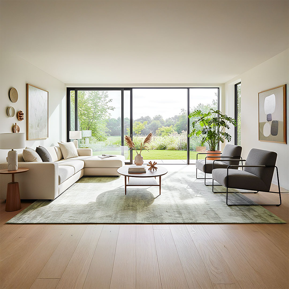 De Flavia collectie staat bekend om zijn fluweelachtige uitstraling. Door het gebruik van viscose krijgt het vloerkleed een lichte glans die verandert met de lichtinval. Dit zorgt voor een levendig effect en geeft het kleed een luxe karakter. Het lichtgroene oppervlak oogt nooit vlak, maar juist dynamisch en elegant, waardoor het moeiteloos combineert met verschillende materialen zoals hout, metaal en stof.