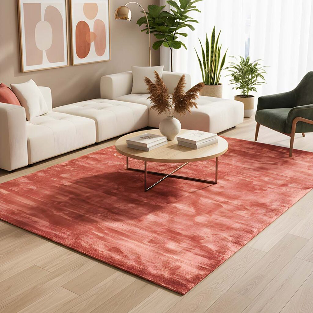 De Flavia collectie staat bekend om zijn fluweelachtige uitstraling. Door het gebruik van viscose krijgt het vloerkleed een lichte glans die verandert met de lichtinval. Dit zorgt voor een levendig effect en geeft het kleed een luxe karakter. Het terracotta kleurige oppervlak oogt nooit vlak, maar juist dynamisch en elegant, waardoor het moeiteloos combineert met verschillende materialen zoals hout, metaal en stof.