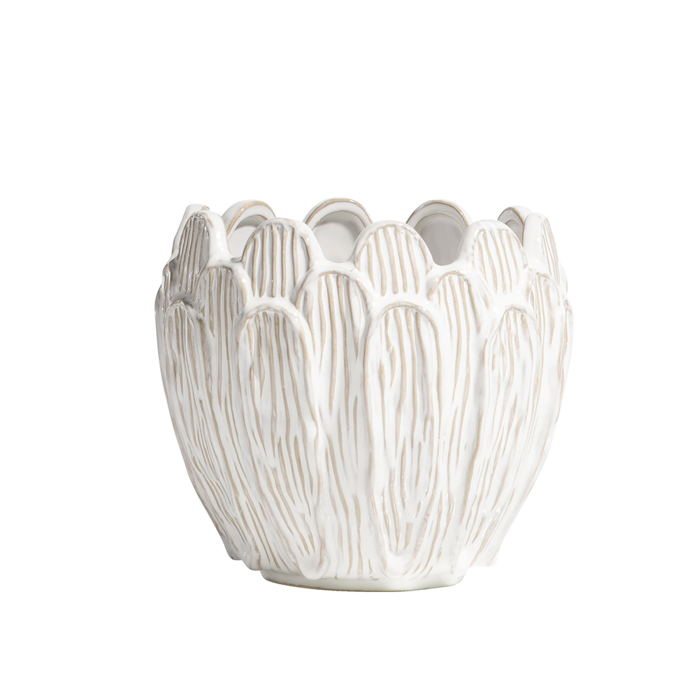 Laat je betoveren door de buitengewone schoonheid van de witte keramieken bloempot Regge uit de exclusieve collectie van COCOmaison. Met zijn unieke bladstructuur aan de buitenkant is Regge een ware eyecatcher die je interieur naar een hoger niveau tilt. Deze bloempot vertoont gelijkenissen met de elegante lotusbloem, maar met een verrassend eigen karakter. Regge is niet alleen een lust voor het oog, maar ook nog eens waterbestendig, zodat je jouw favoriete planten in stijl kunt presenteren.