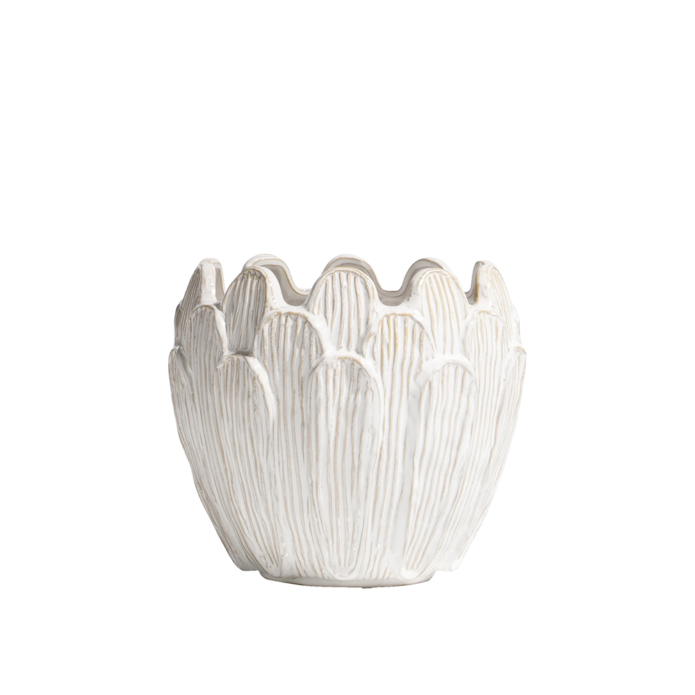 Laat je betoveren door de buitengewone schoonheid van de witte keramieken bloempot Regge uit de exclusieve collectie van COCOmaison. Met zijn unieke bladstructuur aan de buitenkant is Regge een ware eyecatcher die je interieur naar een hoger niveau tilt. Deze bloempot vertoont gelijkenissen met de elegante lotusbloem, maar met een verrassend eigen karakter. Regge is niet alleen een lust voor het oog, maar ook nog eens waterbestendig, zodat je jouw favoriete planten in stijl kunt presenteren.