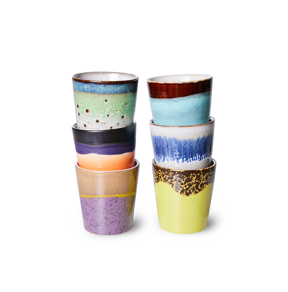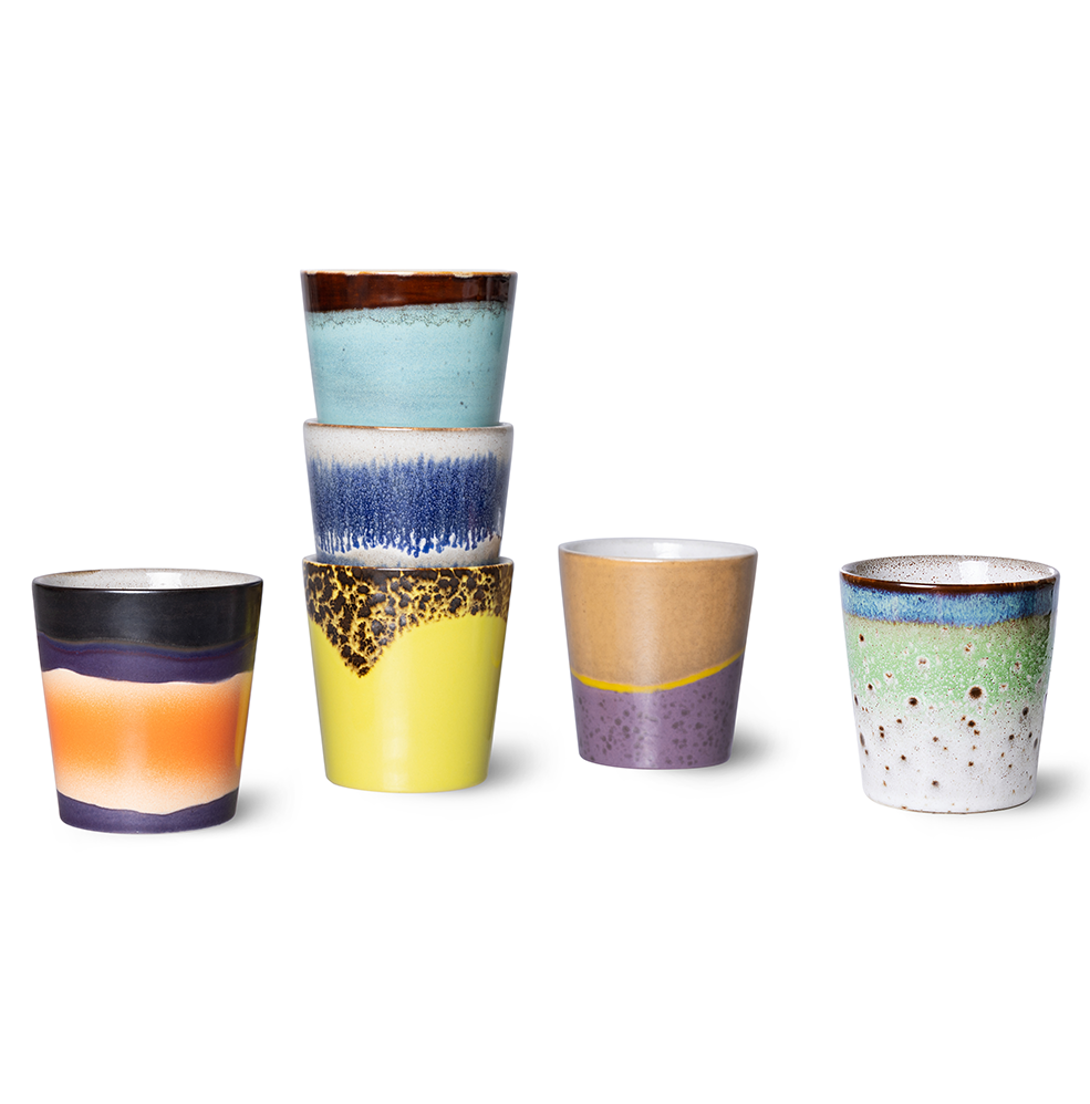 Koffiemokken Pluto zijn verkrijgbaar in een set van 6 keramische mokken in verschillende funky kleuren. Deze mokken komen uit de populaire keramiekserie uit de jaren 70 van HKliving. De mokken zijn ieder voor stuk uniek en met de hand afgewerkt. De set is verpakt in een zwarte iconische jaren 70 keramiek geschenkdoos.