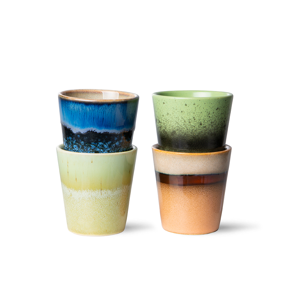 Ristretto Mokken Calypso zijn verkrijgbaar in een set van 4 keramische kopjes in verschillende mooie kleuren. Deze kopjes komen uit de populaire keramiekserie uit de jaren 70 van HKliving. De kopjes zijn ieder voor stuk uniek en met de hand afgewerkt. De set is verpakt in een zwarte iconische jaren 70 keramiek geschenkdoos