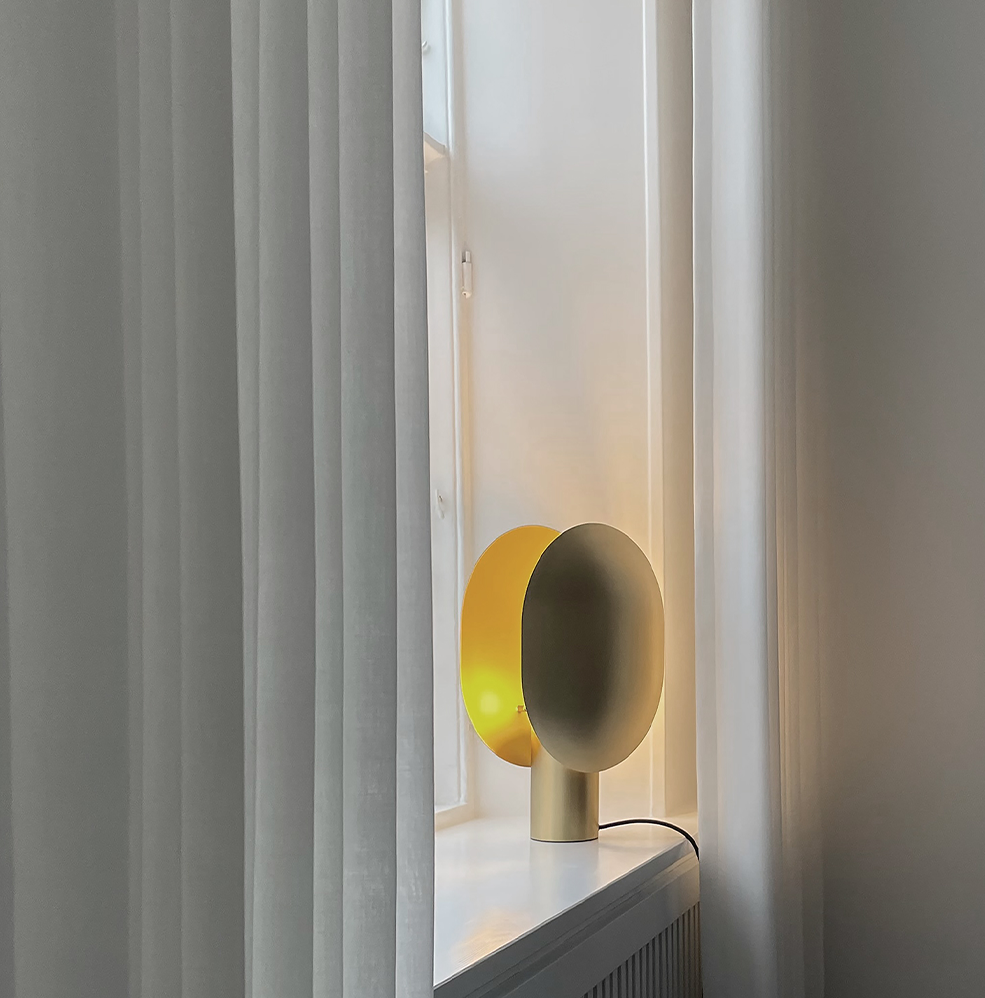 Tafellamp Clam is een lampenserie van plafond- en tafellampen waarin de twee lampenkappen het licht omringen. Clam wordt gekenmerkt door zijn twee tegengestelde tinten die spelen met directe en indirecte verlichting. Op een zeer Japans geïnspireerde manier reflecteert de minimalistische lamp het licht soepel naar beide zijden van de zacht gebogen metalen schermen. De lamp is prachtig vervaardigd in geoxideerd, verguld en vervolgens met de hand geborsteld metaal.