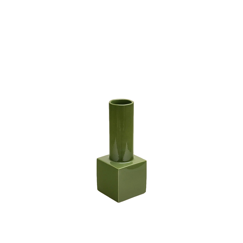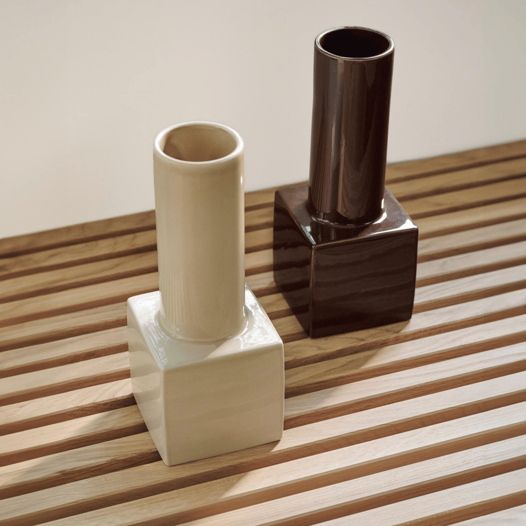 Display is gemaakt van steengoed, gekozen om zijn solide feel en verfijnde uitstraling. Het materiaal geeft een tactiel karakter dat mooi combineert met hout, textiel en natuursteen. De vier kleurvarianten laten zich makkelijk mixen met warme en koele paletten. In olijfgroen leg je een link met planten en andere natuurlijke tonen. Botergeel zet een subtiel grafisch accent in neutrale interieurs. Beige brengt rust, terwijl chocoladebruin juist diepte en warmte toevoegt. Gebruik de vaas met enkele losse bloemen voor een minimalistisch statement of laat hem leeg als sculpturaal object. Combineer desgewenst meerdere kleuren bij elkaar voor een speelse ritmiek op een sidetable of salontafel, en wissel per seizoen van tint om je interieur fris te houden.